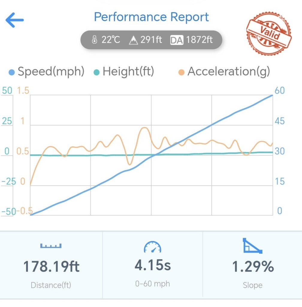 The terminal speed at the end of the quarter mile is slightly impacted by an inconvenient gear change at 100 mph and around 40 meters from the finish.